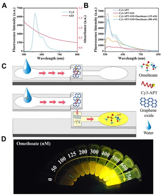 A paper-based microfluidic platform for omethoate detection. (A) Fluorescence and UV–Vis spectra of Cy3 and graphene oxide (GO). (B) Fluorescence response of the Cy3-labeled aptamer alone, with GO, and with GO plus omethoate (125 and 400 nM). (C) Schematic of the microfluidic chip in the absence and presence of omethoate. (D) Fluorescence images showing increased signal intensity with rising omethoate concentration. Reproduced with permission from [], Copyright 2024 Elsevier Ltd.