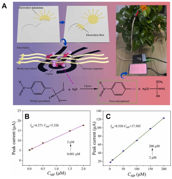 A self-adsorbing electrolyte-enabled microfluidic sensor for methyl parathion (MP) detection on plant surfaces. (A) Schematic of detection principle and on-leaf application. (B,C) Calibration plots for MP in the low (0.001–2 μM) and high (2–200 μM) concentration ranges. Reproduced with permission from [], Copyright 2024 Elsevier B.V.