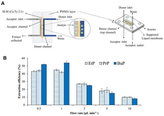 (A) Schematic representation of a microfluidic device for detecting parabens in human urine samples. (B) Extraction efficiency plotted against sample flow rate under conditions using a supported liquid membrane composed of camphor and thymol in a 2 to 1 ratio, sample pH 4, acceptor pH 12, and acceptor flow rate of 1 µL/min. Reproduced with permission from [], Copyright 2022 Elsevier B.V.