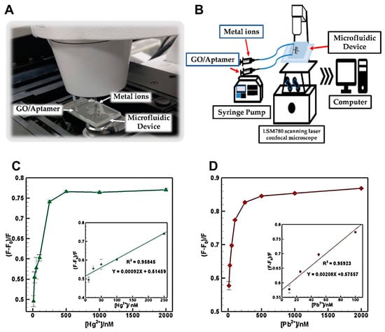Microfluidic aptasensor for Hg2+ and Pb2+ detection in water. (A) Detection setup. (B) Schematic of system integration. (C) Fluorescence recovery for Hg2+ (10–2000 nM); inset: calibration curve (10–250 nM). (D) Fluorescence recovery for Pb2+ (10–2000 nM); inset: calibration curve (10–100 nM). Reproduced with permission from [], Copyright 2020 MDPI (CC BY 4.0).
