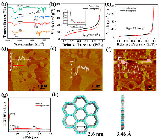 Firstly, Fourier transform infrared spectra (FTIR) indicating the N–H bond of TTA (3210 cm−1, 3320 cm−1, and 3460 cm−1) and the CHO bond of DHTA (1670 cm−1) disappeared while the C=N bond (1623 cm−1) emerged (Figure 1a), demonstrating the successful synthesis of COFTTA-DHTA [41,42]. After epoxy functionalization, the hydroxyl band of COFTTA-DHTA at 1317 cm−1 diminished while a new peak emerged at 1290 cm−1, which was caused by the stretching vibration of the epoxy functional group C–O–C [35]. The results preliminarily indicated the –OH of COFTTA-DHTA was successfully replaced by the epoxy functional group. The N2 adsorption and desorption isothermal test of COFTTA-DHTA indicated that the Barrett–Emmett–Teller (BET) surface area of COFTTA-DHTA was 89.4 m2/g and the pore size was 3.3 nm (Figure 1b). Compared with COFTTA-DHTA, the BET surface area of EP-COFTTA-DHTA decreases significantly to 22.1 m2/g (Figure 1c). This decrease might be ascribed to the fact that the pores of COFTTA-DHTA were blocked owing to the substitution of hydroxyl groups by epoxy functional groups, which further suggests the production of EP-COFTTA-DHTA.