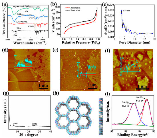 FTIR spectra of TTA (black), 2,6-NA(OH)2 (red), COFTTA-2,6-NA(OH)2 (blue) and Ab2/AuNPs@COFTTA-2,6-NA(OH)2 (green) (a). N2 adsorption and desorption isotherm of COFTTA-2,6-NA(OH)2 (b). Aperture distribution of COFTTA-2,6-NA(OH)2 (c). After being successively modified with AuNPs and Ab2, the roughness of the material surface of the AFM images of COFTTA-2,6-NA(OH)2 (d), AuNPs@COFTTA-2,6-NA(OH)2 (e) and Ab2/AuNPs@COFTTA-2,6-NA(OH)2 (f) accordingly (red line is the cross-sectional height). XRD pattern of COFTTA-2,6-NA(OH)2 (g). Eclipsed conformations of COFTTA-2,6-NA(OH)2 and the π–π stacking distance between the two adjacent layers of COFTTA-2,6-NA(OH)2 (h). The core-level spectra of Au (0) 4f of AuNPs@COFTTA-2,6-NA(OH)2 (i).