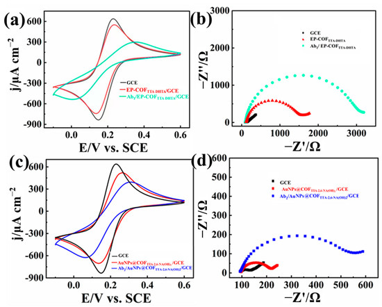 The establishment process of the electrochemical immunosensor was investigated with cyclic voltammetry (CV) and electrochemical impedance spectroscopy (EIS) in 0.1 M KCl solution containing 5 mM [Fe(CN)6]3−/4−. As shown in Figure 3a, GCE has a good pair of reversible redox peaks. After being modified with EP-COFTTA-DHTA, the peak current density of EP-COFTTA-DHTA/GCE decreased and the peak-to-peak potential difference increased slightly, which might be attributed to EP-COFTTA-DHTA inhibiting the electron transport of [Fe(CN)6]3/4−. After Ab1 was further modified on EP-COFTTA-DHTA/GCE, the peak current density was sharply reduced due to biomacromolecules with a weak electrical conductivity that greatly hindered the electron transport of [Fe(CN)6]3/4−. The results proved the effective anchoring of Ab1 on EP-COFTTA-DHTA/GCE. The EIS also confirmed the above conclusion. After being modified by EP-COFTTA-DHTA, Ab1 was consecutively loaded onto the bare GCE, and the impedance value increased from 65 Ω to 1482 Ω and then to 2913 Ω (Figure 3b). CV and EIS were also suitable to prove the successful construction of an Ab2/AuNPs@COFTTA-2,6-NA(OH)2 immunosensor beacon. Figure 3c,d show that after the modification of AuNPs@COFTTA-2,6-NA(OH)2, the peak current density of AuNPs@COFTTA-2,6-NA(OH)2/GCE decreased and the EIS value increased slightly, which confirmed AuNPs@COFTTA-2,6-NA(OH)2 was feasible as the signal probe of the immunosensor. The peak current density decreased significantly after the Ab2 was further loaded, which indicated the Ab2 was modified on COFTTA-2,6-NA(OH)2/GCE successfully. The conclusion could be also confirmed by EIS on account of the impedance value rise from 59 Ω to 221 Ω and 548 Ω as the AuNPs@COFTTA-2,6-NA(OH)2 and Ab2 were subsequently modified on the electrode. As the materials with poor conductivity were modified step by step, the interlayer spacing increased and the mass transfer was blocked, which led to the gradually increased impedance value.