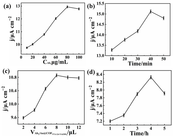 To optimize the experimental conditions, the sandwich-type electrochemical immunosensor constructed under different experimental conditions was tested for 100 U/mL CA 19-9. Firstly, the concentration of Ab1 used to prepare Ab1/EP-COFTTA-DHTA/GCE was optimized. When the Ab1 concentration was increased from 10 μg/mL to 100 μg/mL, the current density increased significantly and then remained constant. With the concentration of Ab1 increased, the number of captured antigens also increased, which was conducive to the specific binding of the antigen and antibody, resulting in a higher current response. Therefore, the optimal concentration of Ab1 was 80 μg/mL (Figure 4a). Then, the incubation time of EP-COFTTA-DHTA/GCE in the Ab1 solution was optimized. As shown in Figure 4b, 40 min was selected as the optimum incubation time. Next, the volume of Ab2/AuNPs@COFTTA-2,6-NA(OH)2 was optimized. When the volume was 8 mL, the current response reached the maximum value (Figure 4c). As shown in Figure 4d, the optimum incubation time of Ab2/AuNPs@COFTTA-2,6-NA(OH)2 was 4 h.