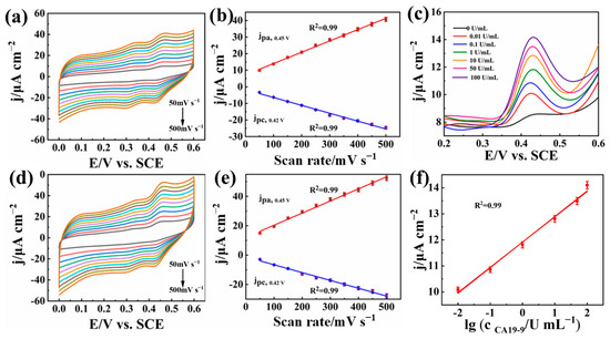 The electrochemical parameters were calculated to explore the electrochemical capacity of the electrochemical immunosensor. In 0.2 M PBS (pH 7.0), the current density of COFTTA-2,6-NA(OH)2 (Figure 5a,b) and AuNPs@COFTTA-2,6-NA(OH)2 (Figure 5d,e) increased linearly with an increasing scan rate, and the oxidation peak of AuNPs@COFTTA-2,6-NA(OH)2 at 0.45 V was significantly higher than that of COFTTA-2,6-NA(OH)2 at the same scan rate, indicating that the modification of AuNPs could improve the conductivity of materials. According to Laviron’s theory, to investigate the properties of COFTTA-2,6-NA(OH)2 [45], the electron transfer coefficient αs was calculated to be 0.5, demonstrating the electrochemical process was a quasi-reversible surface adsorption control process. The electron transfer rate constant (ks) of COFTTA-2,6-NA(OH)2/GCE was 2.33 s−1, while the ks of AuNPs@COFTTA-2,6-NA(OH)2/GCE was 3.54 s−1 when the scan rate was 50 mV s−1. The results confirmed that AuNPs could attach Ab2 firmly and increase the electron transfer rate. The linear fitting diagram showed that the CA 19-9 immunosensor exhibited a wide linear concentration range of 0.0009–100 U/mL and a low detection limit of 0.0003 U/mL (Figure 5c,f).