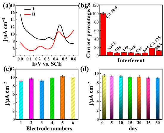 Figure 6a shows that COFTTA-2,6-NA(OH)2 had a significant oxidation peak in N2-saturated PBS at 0.45 V, while the oxidation peak of AuNPs@COFTTA-2,6-NA(OH)2/Ab2/CA 19-9/Ab1/EP-COFTTA-DHTA/GCE (for detection of 10 U/mL CA 19-9) appeared at 0.42 V. The decrease in the oxidation peak potential might be owing to the AuNPs’ enhanced electron transfer. To investigate the anti-interference ability of the electrochemical immunosensor, 10 U/mL CA 19-9 was detected in N2-saturated PBS with 50 ng/mL interferents (including NaCl, glucose, tryptophan (Trp) arginine (Arg), cysteine (Cys), sucrose (Suc), and CA125) that may coexist with CA 19-9 in blood (Figure 6b). The results demonstrated that these substances have less interference with the CA 19-9 sensor. In addition, the repeatability and stability of the electrochemical immunosensor were also tested. Six different AuNPs@COFTTA-2,6-NA(OH)2/Ab2/CA 19-9/Ab1/EP-COFTTA-DHTA/GCE were prepared for the detection of 10 U/mL CA 19-9 with a relative standard deviation of about 1.43%. The results demonstrated the constructed electrochemical immunosensor exhibited excellent repeatability (Figure 6c). Subsequently, the same AuNPs@COFTTA-2,6-NA(OH)2/Ab2/CA 19-9/Ab1/EP-COFTTA-DHTA/GCE was tested three times every five days, and the current density only dropped by 9.80% after 35 days, which proved that the electrochemical immunosensor also possessed good stability (Figure 6d). Moreover, the recovery rate of the diluted human serum samples was 96.5~103.8% (Table S1), and the results obtained by the proposed assay were highly consistent with traditional methods used to detect clinical samples (Table S2), proving that the electrochemical immunosensor has a promising application prospect in clinical practice diagnostics.