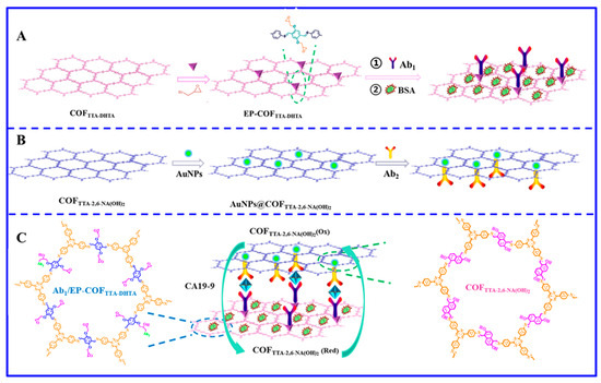 In this work, a novel sandwich-type electrochemical immunosensor was proposed based on two kinds of precision-regulated COFs for ultrasensitive detection of CA 19-9. Specifically, abundant epoxy functional groups were modified on the COFDHTA-TTA surface, and then Ab1 was stably loaded onto the EP-COFTTA-DHTA surface through covalent bonding between the epoxy functional groups and the amino of Ab1. Then, Au nanoparticles (AuNPs) were modified on the surface of electroactive COFTTA-2,6-NA(OH)2 for the loading of Ab2 via the Au–S bond and enhancement of the electrochemical signals simultaneously. The abundant electroactive sites of COFTTA-2,6-NA(OH)2 facilitated the enrichment of the signal probes effectively, which realized ultra-sensitive and reliable detection of trace amounts of CA 19-9.