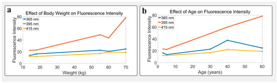| Weight (kg) | Sex | 365 nm−1 | 365 nm−2 | 365 nm−3 | 365 nm-Mean | 365 nm-Std | 395 nm−1 | 395 nm−2 | 395 nm−3 | 395 nm-Mean | 395 nm-Std | 415 nm−1 | 415 nm−2 | 415 nm−3 | 415 nm-Mean | 415 nm-Std |
