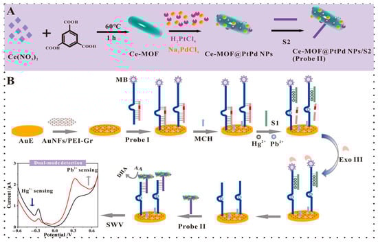 - Liu, H.; Wang, S.; He, B.; Xie, L.; Cao, X.; Wei, M.; Jin, H.; Ren, W.; Suo, Z.; Xu, Y. Simultaneous Hg2+ and Pb2+ Detection in Water Samples Using an Electrochemical Aptasensor with Dual Signal Amplification by Exonuclease III and Metal-Organic Frameworks. Anal. Chim. Acta 2024, 1316, 342800. [Google Scholar] [CrossRef]