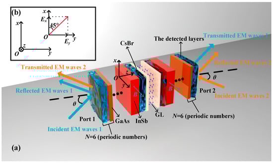 The transmission characteristics of two beams of coherent waves can be calculated by the transfer matrix method of layered structure theory [], which requires determining the structure parameters of the VP. Firstly, the VP consists of InSb [], GL [], gallium arsenide (GaAs) [], cesium bromide (CsBr) [], and cavities, defined as A, C, D, H, and E. The use of cavities is to act as the detected layers to hold detected objects. The total configuration of the VP can be expressed as {(ED)6AHECEHA(DE)6}, the related thickness of which can be represented by dA = 8.5 μm, dC = 0.34 nm, dD = 1.9 μm, dH = 1.55 μm, and dE = 8.13 μm. Notably, the relative magnetic permeabilities of all media in the VP are all equal to 1. The RIs of GaAs and CsBr are determined as nGaAs = 3.43 [] and nCsBr = 1.15 []. Especially, within 1.72–2.14 and 15–16 THz, the dispersion effects of GaAs and CsBr are very weak and can be ignored [,], which can be regarded as ideal materials. The GL is located in the center of the VP, and the dielectric constant is connected with the electrical conductivity σ []. Considering that the dielectric functions of InSb are influenced by the temperature Te and external magnetic fields B [], the initial values of the Te and B are fixed as 300 K and 0.98 T. In addition, the incident angle Θ of EM waves is set as 0°.