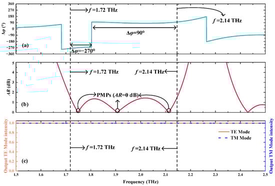 Based on the transfer matrix method of the layered structure theory [], the propagation characteristics of EM waves can be calculated, with specific contents detailed in Section 2. When the Te is fixed as 300 K and B is equal to 0.98 T, a certain polarization conversion from LPWs to RHCPWs can be achieved in the range of 1.72 THz~2.14 THz. As shown in Figure 2a,b, the Δφ is 90° or −270° and AR is smaller than 3 dB within the frequency coverage of 1.72 THz~2.14 THz, representing the polarization state of the output EMs is RHCPWs. Notably, in Figure 2b, there are three frequency points of AR being 0 dB, called PMPs, in the operating frequency band, which are regarded as the manifestation of CPPC []. Here, the state of the output EM waves is standard CPWs under the case of meeting the conditions of PMPs. According to Equations (18), (19) and (20), to make the AR of EM waves equal to 0 dB, the Δφ must remain 90° ± 180°n (n = 0, 1, 2…), and the amplitude of electric fields related to TE waves is the same as that of TM waves. So, if the output EM waves do not satisfy the conditions of PMPs, the state of the output EM waves can be CPWs, LPWs, or EPWs, the AR of which can not form an obvious and easy-to-distinguish frequency peak. However, owing to the fact that biosensing, based on EM waves, usually needs to establish a linear relationship between the displacement of a detecting frequency peak and changes in the detected biomass, there are only the PMPs suitable for biosensing based on the CPPC strategy. The specific discussion of PMP used for detection will be illustrated below. Moreover, as shown in Figure 2c, when the output EM waves are RHCPWs, the energy loss of EMs under the TE and TM modes is nearly approaching 0, allowing polarization conversion from LPWs to RHCPWs to have an extremely high polarization conversion rate based on the interference of coherent EM waves.