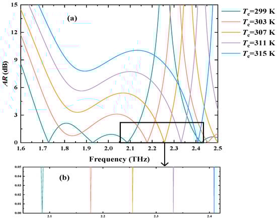 The core of realizing the detection application of PMP is to form a bijective relationship between the shift in PMP and external environment parameters [], where the changes in environment parameters can produce the variations in the local phase related to RHCPWs to further make the frequency shifts of PMP. Considering the temperature tunability of InSb, temperature can serve as an important factor to adjust the polarization states of the output EM waves, allowing the proposed VP to have great potential in realizing temperature detection by the frequency shift in PMP. When nE is fixed as 1.35 and B is 0.98 T, Figure 3a displays the specific connection between the Te and AR of output EM waves. With Te altering from 299 K to 315 K, the frequency of the PMP will linearly shift from 2.08597 THz to 2.40874 THz. The enlarged image of PMP is demonstrated in Figure 3b, where the AR of PMP is almost 0 dB, and the shift in the frequency related to PMP builds a linear relationship with the variations in Te. Therefore, it is feasible for the designed VP to fulfill the temperature detection by observing the frequency shift in PMP.