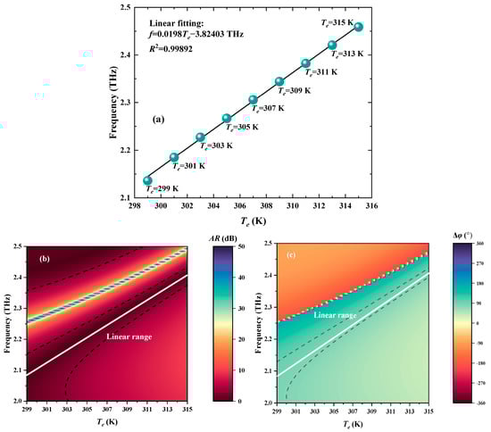 To illustrate the possibility of realizing the Te detection by the PMP method, the Te and frequency of PMP can be linearly fitted, which is indicated in Figure 4a. The linear fitting relationship (LPR) can be described as f = 0.0198Te − 3.82403 THz with the S being 0.0198 THz/K. Moreover, the determination coefficient R2 is as high as 0.99892 [], where the quality of the linear fitting is better when the R2 is closer to 1 []. Therefore, the VP can be effectively employed for the accurate measurement of temperature with high sensing performance. In addition, the white lines, representing linear range, in Figure 4b,c obviously show the potential of utilizing PMP for temperature detection, which has high sensitivity and a wide detection range. Under the frequency of PMP, the standard RHCPWs are continuously output by the proposed VP, proving the effectiveness of the detection based on CPPC.