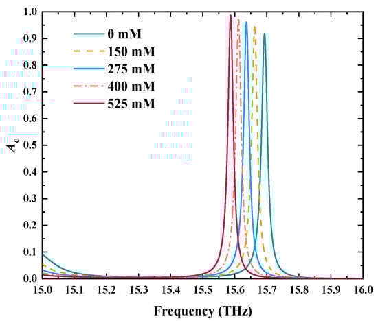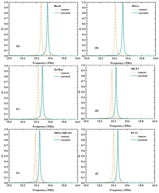 When the working state of the suggested VP is switched from CPPC to CPA, the Te is fixed as 300 K, and B at 0.5 T. At this time, an extremely narrow CPA peak can be generated by the VP within 15 THz–16 THz. Given that the condition of the zero amplitude of output fields must ensure that the eigenvalues of the scattering matrix related to CPA is zero when the amplitude of input fields is not zero [], the CPA peak tends to be very sensitive to the variations in the external environment, making the detection of cancerous cells possible. The specific situations are demonstrated in Figure 5a–f, where the frequency of the CPA peak corresponding to normal cells is all larger than the frequency of the CPA peak related to cancerous cells.