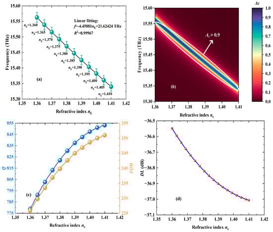 Through linearly fitting the relationship between the RIs of cancerous and normal cells and the frequency shift in the CPA peak, a LFR can be obtained and displayed in Figure 6a. Notably, Figure 6a contains error bars to show the S and linearity of the VP to the detection of cancerous cells, where the RIs of cancerous cells are assumed to fluctuate by 0.25% overall because the electromagnetic devices are sensitive to parameter changes in the VP. The LFR can be expressed as f = −4.45881nE + 21.62424 THz, and the related S is determined as −4.45881 THz/RIU. The excellent linearity of detecting cancerous cells can be fully shown by the relevant R2 of 0.99967. Also, in Figure 6b, the values of the CPA peak, employed for detection, all remain larger than 0.9, indicating the sensing stability of cancerous cells based on the proposed VP. To further evaluate the detection performance of the VP, the Q, figure of merit (FOM), and detection limit (DL) are introduced. The larger Q and FOM are on behalf of the better detection performance. The DL is the opposite of Q and FOM. As demonstrated in Figure 6c,d, the minimum Q and FOM are equal to 778.92 and 225.84, respectively, which both become larger with the RI increasing. Also, the DL will decrease when the RI increases, the maximum value of which is −36.54 dB. Therefore, the proposed VP has an excellent detection performance in distinguishing cancerous and normal cells.