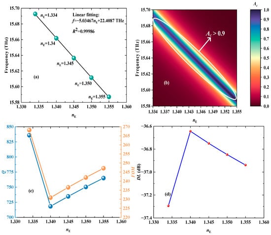 The drawings of the detection performance of five different RIs corresponding to COVID-19 SCs. (a) The LPR between the RI and the frequency of the CPA peak. (b) The three-dimensional fitting diagram when the nE changes from 1.334 RIU to 1.355 RIU. (c) The variations in Q and FOM with the nE increasing from 1.334 RIU to 1.355 RIU. (d) The changes in DL as the nE alters from 1.334 RIU to 1.355 RIU.