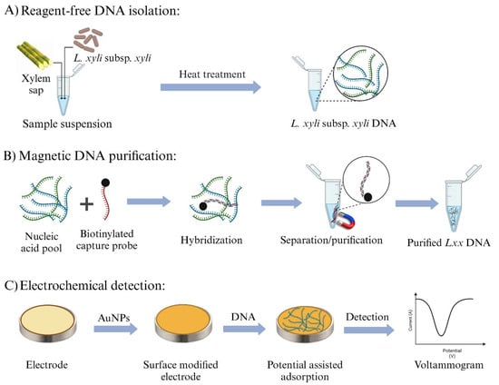 Overview of the electrochemical assay workflow for detecting Lxx DNA. (A) Bacterial DNA is isolated from sugarcane xylem sap using a simple boiling lysis method. (B) The isolated Lxx DNA is selectively captured using biotinylated complementary DNA probes and isolated via streptavidin-coated magnetic beads. (C) Captured Lxx DNA is thermally released and field-induced to adsorb onto AuNPs-modified SPGE, followed by electrochemical detection using DPV.