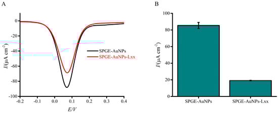 Assay functionality was evaluated by comparing electrochemical responses in the presence and absence of synthetic Lxx targets (Figure 2A,B). Figure 2B illustrates the calculated percentage change in current density between the blank (no DNA) and test conditions. This normalization emphasizes the relative suppression in electrochemical signal due to target DNA adsorption. The presence of targets caused a significant decrease in current response compared to the no-target control, demonstrating the assay’s effectiveness. This decrease arises from the combined effects of (i) coulombic repulsion between the negatively charged adsorbed DNA and the ferricyanide ions at the AuNP-modified SPGE gold sensor surface via the DNA–gold affinity interaction and (ii) steric hindrance of the active sites—some of which are already occupied by adsorbed DNA—preventing redox species from contacting the electrode surface. These repulsion and steric hindrance effects impede electron transfer during the one-electron redox reaction, leading to a diminished faradaic current relative to the control []. In addition to steric hindrance and electrostatic repulsion, it is plausible that DNA adsorption induces interfacial changes, such as conformational rearrangements or partial hybridization-like interactions that modulate the charge transfer resistance at the electrode surface. Prior studies have shown that DNA hybridization can significantly alter electrode impedance, thereby affecting redox probe access and overall signal output []. Although this study focused on potential-induced adsorption of single-stranded DNA and did not involve classical hybridization events, such impedance-related effects cannot be entirely ruled out. While electrochemical impedance spectroscopy (EIS) was not performed here, the consistent trend in current suppression with increasing DNA concentration, combined with high reproducibility and strong linearity (R2 = 0.98), supports our hypothesis that the signal decreases are due to DNA blocking the electrode surface and repelling charged molecules. Future studies incorporating EIS measurements will be valuable for dissecting the contributions of impedance modulation alongside steric and electrostatic effects, thereby offering deeper mechanistic insight into DNA-induced signal variation.