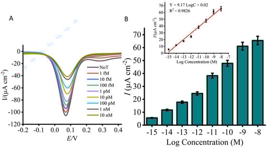 Analytical sensitivity of the assay using titrated concentrations of synthetic Lxx target DNA (1 nM to 1 fM). (A) DPV signals reveal concentration-dependent decreases in current density relative to the no-target control (NTC). (B) Bar graph summarizes the signal changes across tested concentrations. The inset shows the calibration curve (log concentration vs. current density), indicating strong linearity across the tested range. Error bars represent standard deviations (SD < 5%) from independent runs with separately prepared electrodes (n = 3).