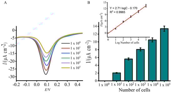 Sensitivity evaluation using total DNA extracted from known numbers of Lxx cells (105 to 10 cells/μL). (A) DPV signals show decreasing current with increasing input cell numbers, corresponding to higher DNA loads. (B) Mean percentage current response change for each input cell concentration. Inset displays a linear calibration curve for DNA quantity vs. EC signal. Error bars show SD from three replicates.