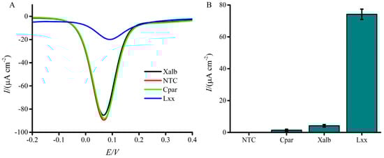 Specificity of the electrochemical assay for Lxx detection. (A) DPV signals compare current responses to DNA from Lxx, Xanthomonas albilineans (Xalb), and Ceratocystis paradoxa (Cpar) cells. (B) Bar graph illustrates the relative percentage change in current response for each pathogen. A significantly higher signal suppression is observed with Lxx compared to other organisms. NTC = no target control; NG1 = Xalb (negative control 1); NG2 = Cpar (negative control 2). Error bars indicate SD (n = 3).
