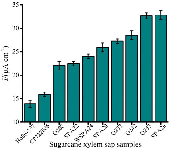 The developed Lxx electrochemical biosensor was applied to detect varying amounts of Lxx in xylem sap samples from 10 sugarcane cultivars collected from a field trial. Detected Lxx DNA levels in most samples fell within the assay’s detection limit of 1 fM, highlighting its suitability for real-world analysis. Detected Lxx levels corresponded well with cultivar disease ratings. For example, samples from cultivars Ho06-537 and CP72-2086 exhibited relatively low current responses, indicative of lower bacterial loads and consistent with their moderate resistance to RSD (Figure 6). Cultivars Q208 and SRA22 were classified as intermediately resistant, while WSRA24, SRA20, and Q232 were considered susceptible. Intermediate susceptible cultivars Q242, Q253, and SRA26 were identified as highly susceptible (Figure 6). These results aligned closely with established industry disease ratings [].