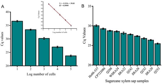 A randomized complete block field trial was established at SRA Woodford (S 26.93°, E 152.78°) in September 2020, using 10 sugarcane cultivars with known RSD resistance ratings (CP72-2086, Ho06-537, Q232, Q253, SRA20, Q208, WSRA24, Q242, SRA26, and SRA22) as shown in Table 1 [,,,]. One-budded setts were hot-water treated (52 °C, 30 min), inoculated with Lxx [], germinated in moistened vermiculite, and transplanted to the field. At 53 weeks post-inoculation, xylem sap was extracted from three stalks per cultivar and stored at –20 °C until use.