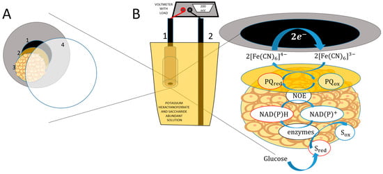 Schematic representation of the MFC and charge transfer mechanism. (A). 1 is graphite, 2 is PQ, 3 is yeast, 4 is membrane. (B). 1 is anode, 2 is cathode.