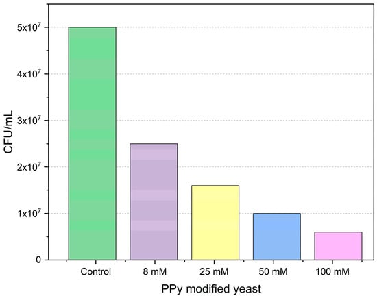 To evaluate the impact of PPy modification on the growth and proliferation of Saccharomyces cerevisiae yeast, colony-forming unit (CFU) assays were performed using PPy solutions at varying concentrations. Colony-forming unit (CFU) quantifications are presented in Table 1.