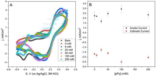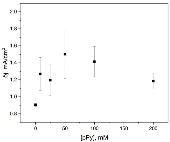 The resulting Fe2+ oxidative peak δj values were plotted against the concentration of pyrrole used in yeast modification (Figure 5). The change in current density values indicates that using 50 mM pyrrole results in the most significant current density, which may be attributed to an increase in charge transfer due to the conductive properties of PPy.