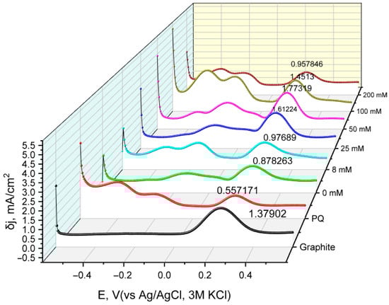 Differential current density curves for various modified working electrode samples used in the electrochemical system. Measurements were conducted by sweeping the potential from −0.6 V to +0.6 V with a step potential of 5 mV, pulse amplitude of 50 mV for a duration of 20 ms, and a scan rate of 50 mV/s using a Ag/AgCl reference electrode in KCl 3M. Graphite: unmodified graphite electrode; PQ: PQ-modified graphite electrode; 0 mM: non-modified yeast and PQ-modified graphite electrode; 8 to 200 mM: PQ- and PPy-modified yeast on graphite working electrodes.