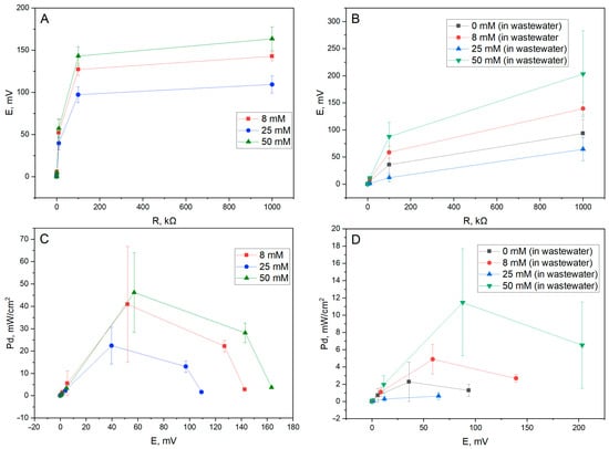 Power density measurements of the constructed yeast-based MFCs. (A) Potential load dependency of the MFC in 50 mM glucose and 20 mM K3[Fe(CN6)] solution in PBS while using yeast modified by different concentrations of PPy. (B) Potential load dependency of the system in wastewater samples for different PPy concentrations used in the modification of the yeast. (C) Power density potential dependency of the MFC in glucose/K3[Fe(CN6)] samples. (D) Power density potential dependency of the MFC in wastewater samples.