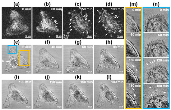 Figure 2 illustrates the morphological changes in the HeLa cell over 180 min following doxorubicin treatment, as observed by FF-OCT and IRM-like imaging. FF-OCT cross-sectional imaging revealed a relatively homogeneous reflection pattern at 0 min after drug treatment (Figure 2a), with emergence of irregular protrusions (echinoid spikes) on the cell surface starting at 80 min (indicated by arrows in Figure 2b). These protrusions progressively increased in both density and size, spreading across the entire cell by 150 min (Figure 2c) and evolving into prominent bleb structures by 180 min (Figure 2d). IRM-like imaging (Figure 2e–l) highlighted the cell–substrate interface and revealed detailed structural breakdown characteristic of apoptosis. Between 40 and 60 min post-treatment (Figure 2f,g), the plasma membrane of the cell, which was in direct contact with the culture substrate, began to rupture (marked by an asterisk and arrowheads in Figure 2g), accompanied by fragmentation of internal structures, indicating the onset of early apoptosis. Between 120 and 180 min (Figure 2j–l), the cell exhibited progressive contraction, a decrease in the cell–substrate interference pattern, and eventual collapse of cellular architecture. In particular, we observed dynamic filopodial remodeling, characterized by elongation and increased filopodial abundance over time (arrows in yellow-boxed area in Figure 2m). A marked increase in filopodial density (arrows in blue-boxed region in Figure 2n) indicated active reorganization of cell–substrate adhesion. These results demonstrate that multimodal FF-OCT and IRM-like imaging enable comprehensive analysis of internal structural breakdown, membrane dynamics, and adhesion remodeling during apoptosis at the single-cell level.