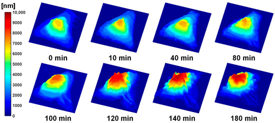 Figure 3 shows the 3D surface topography of the apoptotic HeLa cell in Figure 2. In the pre-treatment map (0 min), the central region of the cell exhibited a uniform surface profile with a gentle dome-shaped protrusion measuring approximately 4–5 μm in height. No significant changes were observed at 10 and 40 min. Starting at 80 min, the central protrusion gradually increased in size, accompanied by a slight steepening of the slope. Pronounced morphological changes appeared at 100 min post-treatment, with the central protrusion rapidly increasing to 6–7 μm. This protrusion further expanded to 8–9 μm by 120 min and reached nearly 10 μm at 140 and 180 min. The observed central protrusion and peripheral depression were attributed to apoptotic volume decrease (AVD) and cytoskeletal stress redistribution during apoptosis. These findings indicate that FF-OCT-based topographic mapping facilitates morphological analysis, surpassing conventional phase imaging techniques by enabling the simultaneous, quantitative assessment of temporal and spatial changes in cell surface height.