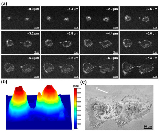 FF-OCT imaging was performed on two healthy HeLa cells before ethanol-induced necrosis to record the structural and topographical characteristics of the normal state, with imaging depths ranging from −0.8 to −7.4 μm (Figure 4a). At each depth, the boundaries between the nucleus and cytoplasm were clearly visible, and the internal structures of the monolayer-adherent cells were well resolved. The 3D topographic maps, generated based on the peak reflection depth at each xy coordinate (Figure 4b), revealed a dome-shaped elevation of approximately 8–9 μm in the nuclear region of both cells, representing typical healthy cell morphology. IRM-like imaging (Figure 4c) shows fine filopodial projections (F) extending from the plasma membrane of the cell, along with cell–substrate interference patterns, indicating strong cell adhesion to the culture dish surface. These baseline FF-OCT and IRM-like images provide reference data for direct comparison with necrotic features, such as structural collapse, reductions in surface height, and filopodial loss, following ethanol treatment.