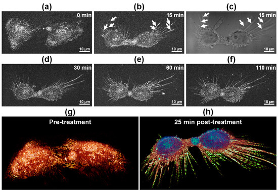 Figure 5 shows the time-lapse imaging of ethanol-induced necrosis using FF-OCT and volume rendering. Immediately prior to treatment, FF-OCT images revealed well-defined boundaries between the two cells and visible internal reflective structures, with cells maintaining stable morphology (Figure 5a). However, by 15 min post-treatment, strong scattering signals were observed emanating from the cells (arrows in Figure 5b), indicative of cellular exudation resulting from membrane rupture. At the same time point, bright-field imaging (Figure 5c) confirmed cellular leakage, demonstrating a strong correlation between FF-OCT signals and exudate structures. At 30, 60, and 110 min, cross-sectional FF-OCT images (Figure 5d–f) displayed progressive membrane damage, deformation of cell bodies, and loss of reflectivity. Volume rendering, obtained before treatment and 25 min after treatment, illustrated structural collapse and material dispersion during necrosis (Figure 5g,h). These findings demonstrate that FF-OCT enables real-time, label-free, non-invasive imaging of necrotic processes at the single-cell level, providing precise 3D visualization of material leakage and extracellular structural damage.