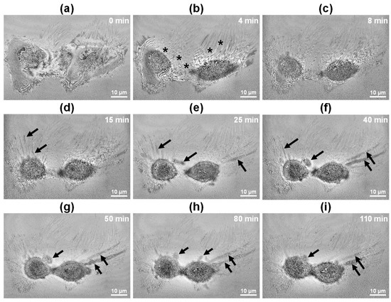 Figure 6 presents the dynamics at the cell–substrate interface of the two necrotic HeLa cells in Figure 5, as observed using IRM-like FF-OCT imaging. At 0 min, both cells were firmly attached to the culture substrate, maintaining stable adhesion structures (Figure 6a). However, starting at 4 min, the cell membranes exhibited rapid damage and loss of integrity (indicated by asterisks in Figure 6b), suggesting the rapid activation of the necrosis pathway. By 8 min, the cell–substrate boundary had become blurred (Figure 6c). Between 15 and 25 min, extracellular exudate spread was clearly visible (arrows in Figure 6d,e). These exudates exhibited low reflectivity in IRM-like images, likely due to light absorption and scattering by the cytoplasmic components. From 40 to 110 min, the cell body outline gradually disappeared, adhesion structures disassembled, and overall cell morphology collapsed (Figure 6f–i). This rapid membrane disruption and intracellular content leakage were markedly different from the gradual contraction and bleb formation observed during apoptosis. Compared with the IRM-like images of apoptotic cells in Figure 2, Figure 6 demonstrates a faster breakdown of cell boundaries, more extensive exudate release, and a fundamentally distinct pattern of morphological collapse. These findings indicate that IRM-like FF-OCT imaging enables effective qualitative classification of cell death pathways at the single-cell level, providing a real-time monitoring tool for necrosis progression.