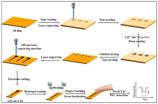 | Cu2+ | PVA hydrogel | Antifouling barrier | PI film/LIG-In-CdS/Hydrogel | 1.28 ng∙mL−1–5.12 μg∙mL−1 | -- | Sweat sample | [60] |