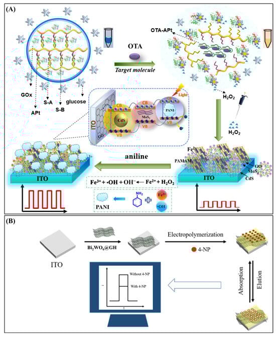 | Ochratoxin A | Polyaniline hydrogel | In situ conductive PANI matrix for signal amplification | ITO/GO-MoS2-CdS/PAMAM | 0.0001–0.1 ng∙mL−1 | 0.05 pg∙mL−1 | Red wine | [112] |