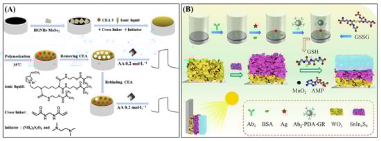 | CEA | Polymerized ionic liquid hydrogel | Imprinted recognition matrix and ion-conductive layer | GCE/MoSe2/HGNBs | 0.05–5.0 ng∙mL−1 | 11.2 pg∙mL−1 | Serum sample | [115] |
