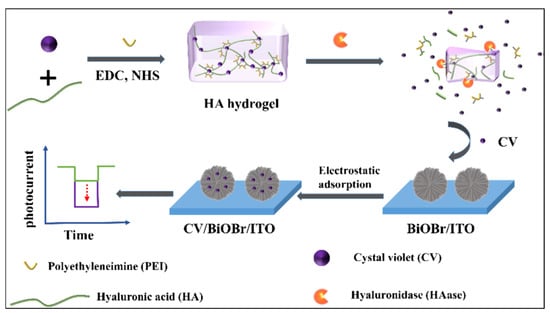 | Hyaluronidase | HA–PEI hydrogel | Target-responsive hydrogel for signal amplification | ITO/BiOBr & (crystal violet) | 0.10–120 U∙mL−1 | 0.034 U∙mL−1 | Urine sample | [110] |
