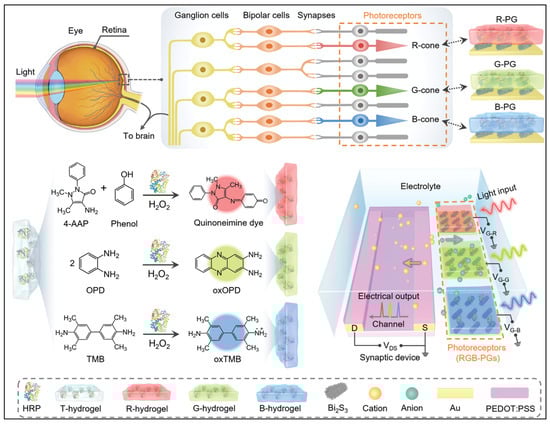 | Color-specific light signals | Gelatin hydrogels | As chromogenic reaction matrix | Au/Bi2S3 | Qualitative RGB color range, biomolecule concentration-dependent PSC modulation | Response to H2O2 down to 0.1 mM | Artificial visual synapse with RGB image | [69] |