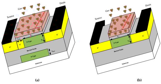 In parallel, silicon-on-insulator tunnel field-effect transistors (SOI-TFETs) represent an advanced class of gas sensors with intrinsic advantages such as ultra-low power consumption, steep subthreshold swing (SS), and enhanced electrostatic control [17,18,19]. SOI substrates offer excellent electrical isolation, reducing parasitic effects and enabling device scaling, while TFETs leverage band-to-band tunneling for energy-efficient switching and heightened sensitivity near threshold voltages [6,20].