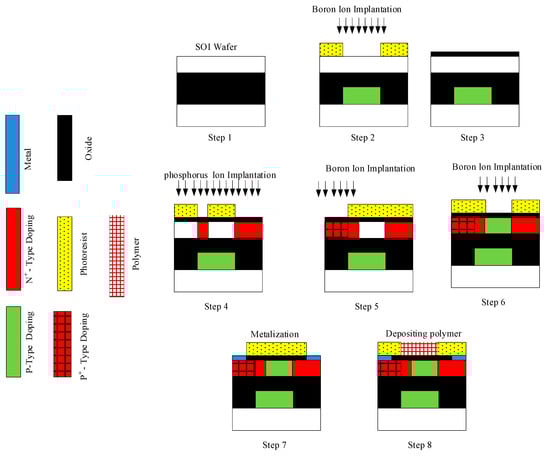 In the rest of the work, the fabrication steps of the proposed gas sensor have been proposed by demonstrating them in Figure 2. Eight proposed steps are introduced as the subsequent statements [18,20,35,36]: