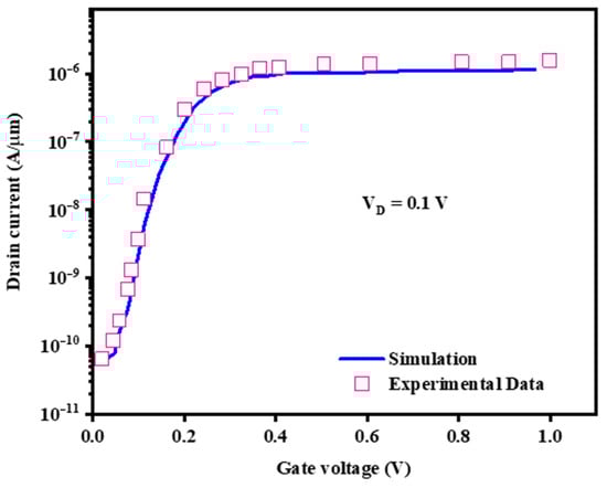 The simulation of a tunnel field-effect transistor (TFET) with metal and conducting polymer gates as a gas sensor was calibrated against experimental results using polypyrrole-based gates [39]. The simulated device achieved a subthreshold swing of 11.2 mV/dec, closely matching the experimental 13 mV/dec at a gas concentration of 4.6 × 10−3 mol dm−3. This validates the simulation parameters and confirms the transistor’s feasibility for gas sensing applications. By applying this robust simulation framework, we capture not only the quantum transport behavior necessary for trace gas detection but also extend the model’s relevance to complex microbial biosensing environments.