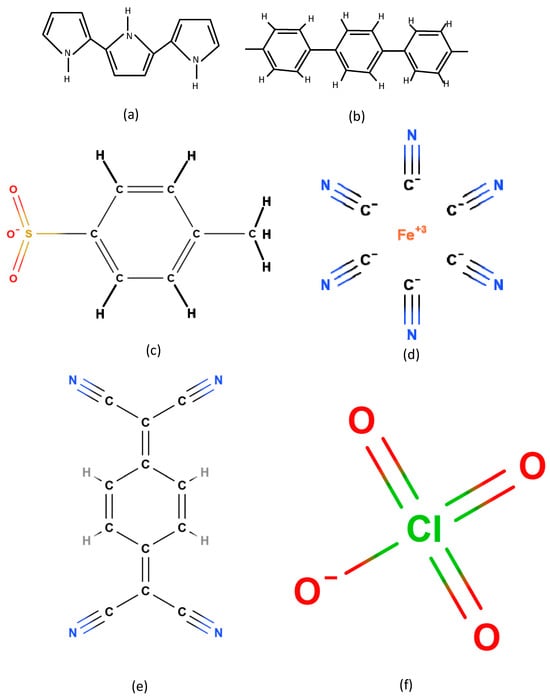 A visualization of conducting polymers implemented as sensing element in the proposed sensor in the cases of (a) polypyrrole (PPy) and (b) p-polyphenylene (PPP). (c) TOS in PPP-TOS/AcCN polymers and (d) Fe(CN)63− in PP-FE(CN)63−/H2O as well as (e) TCNQ in PPP-TCNQ-TOS/AcCN and (f) ClO4− in PPP-ClO4/AcCN are illustrated.