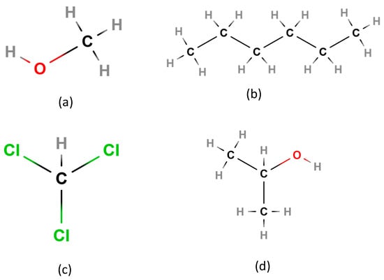Methanol gas (CH3OH/MeOH) is a colorless, highly flammable vapor with a faintly sweet odor; inhalation can lead to severe toxicity, including nervous system damage and even death [45,46]. Chloroform vapor (CHCl3) is dense, non-flammable, and can induce dizziness or anesthesia at high concentrations. Isopropanol (i-Propanol) vapor is flammable, has a strong odor, and may cause narcotic effects when inhaled in large quantities. Hexane gas (C6H14) is volatile, highly flammable, non-polar, and neurotoxic with prolonged exposure. While all four analytes have practical industrial applications, their potential hazards demand detection at very low concentrations. The proposed sensor, utilizing polymer-coated gates, detects these vapors through modulation of the gate workfunction via analyte–polymer charge-transfer interactions. This same sensing principle is translatable to microbial biosensing, where volatile organic compounds (VOCs) and metabolic byproducts emitted by microbes similarly alter the electronic properties of conducting polymers. Thus, characterizing sensor response to volatile chemicals also supports its utility in microbial diagnostics. The molecular structures of these analytes are shown in Figure 3, providing a visual basis for understanding their interaction potential with the polymer matrix.