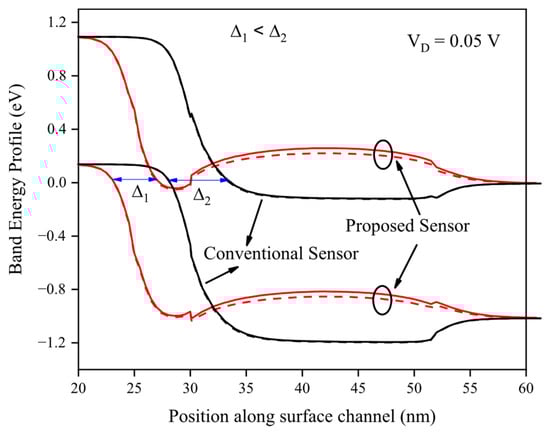 The energy profile along the surface channel for the proposed and conventional gas sensors. The drain voltage has been fixed at the bias of 0.05 V.