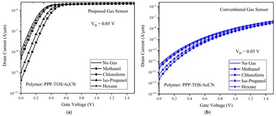 Drain current versus the gate voltage for (a) proposed gas sensor (b) conventional gas sensor. The PPP-TOS/AcCN polymer is exposed to different gases.