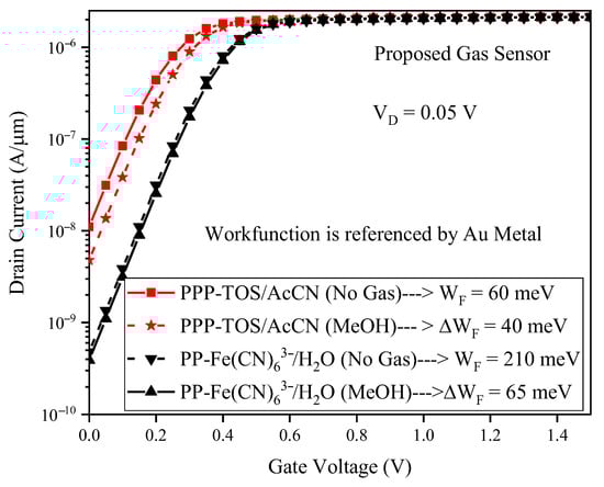 Figure 8 compares the proposed sensor’s response to MeOH detection using two conducting polymers: PPP-TOS/AcCN and PP-Fe(CN)63-/H2O. PPP-TOS/AcCN produces a substantially greater change in drain current upon gas exposure, attributable to its higher charge transfer efficiency with MeOH analytes. This signifies enhanced interaction at the polymer/gas interface, directly amplifying sensitivity. Therefore, careful selection of the sensing polymer, as investigated comprehensively throughout this study, is instrumental in customizing gas sensor performance, distinguishing this research from prior works by providing practical polymer selection guidelines for diverse analytes.